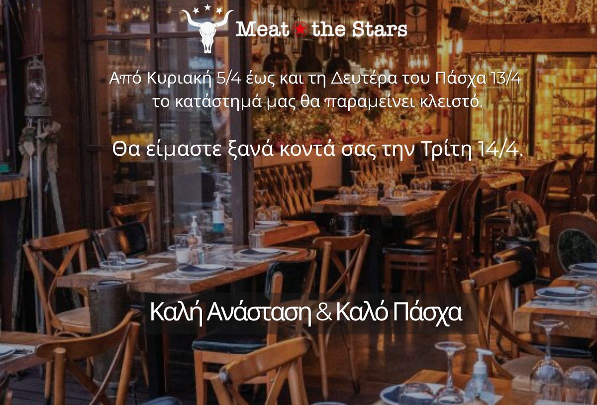 Το Meat The Stars σας προσκαλεί σε μια μοναδική εμπειρία γαστρονομίας στον ανανεωμένο χώρο του στο Πικέρμι. Ξύλο, δέρμα και πέτρα συνθέτουν μια ζεστή ατμόσφαιρα που θυμίζει ταινία Far West και γεννά την αστείρευτη ανάγκη να απολαύσετε ένα γεύμα που δεν μοιάζει με κανένα προηγούμενο!